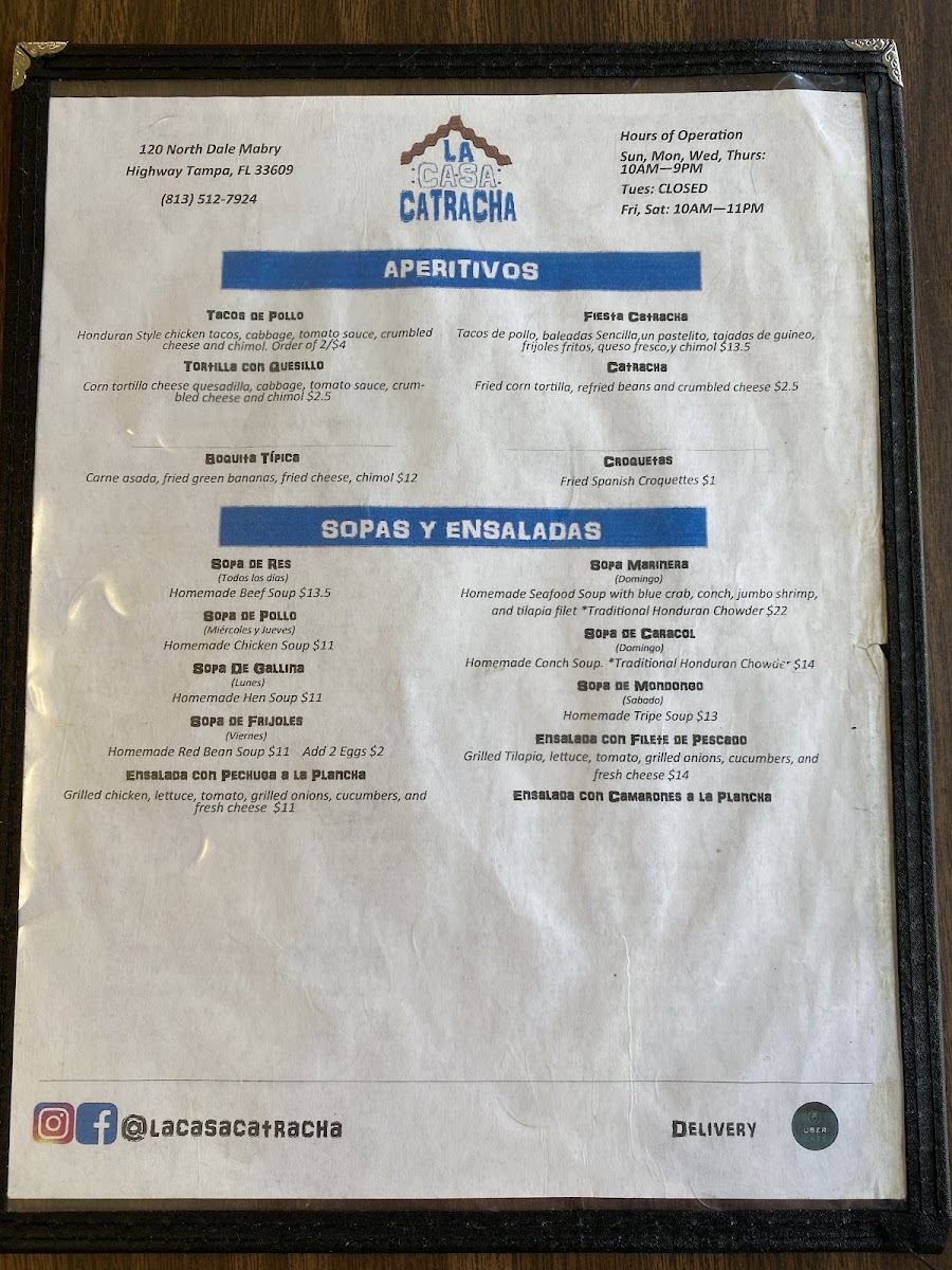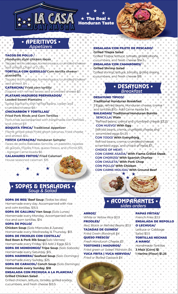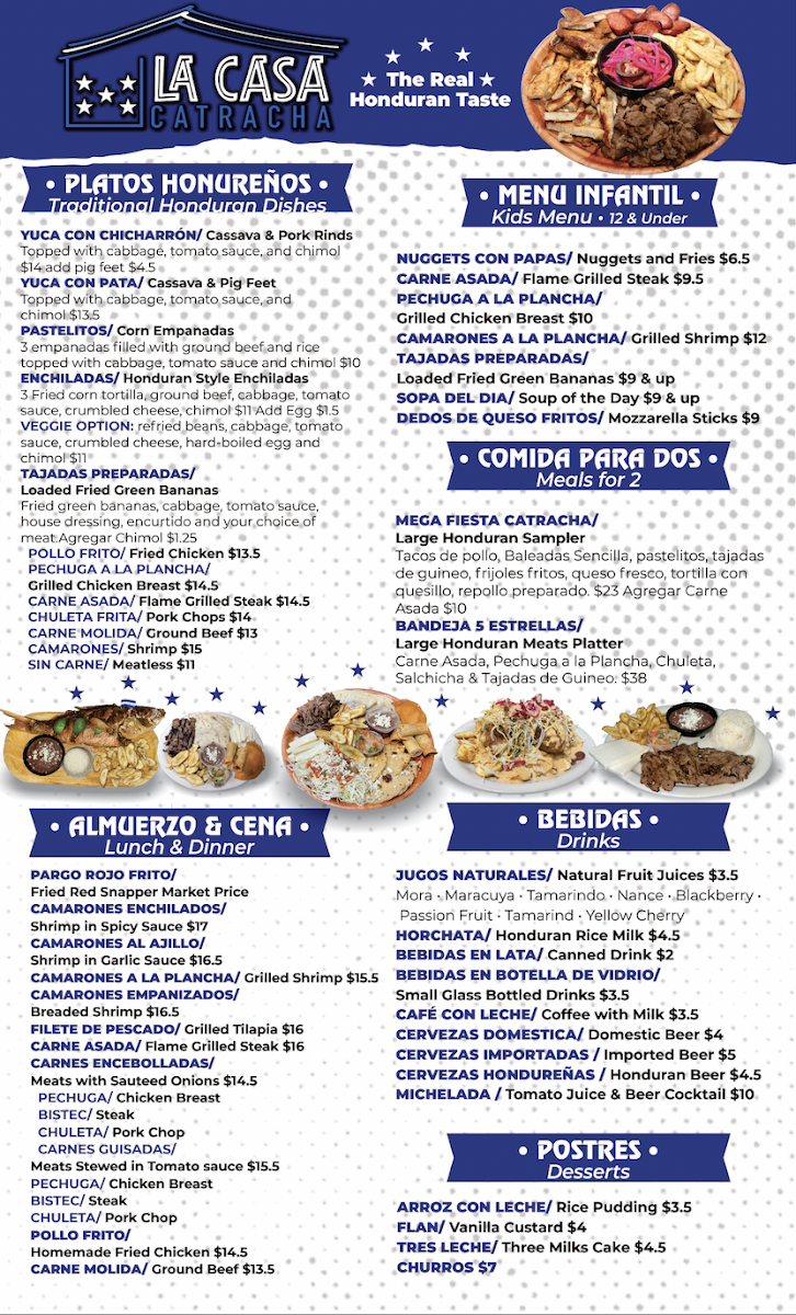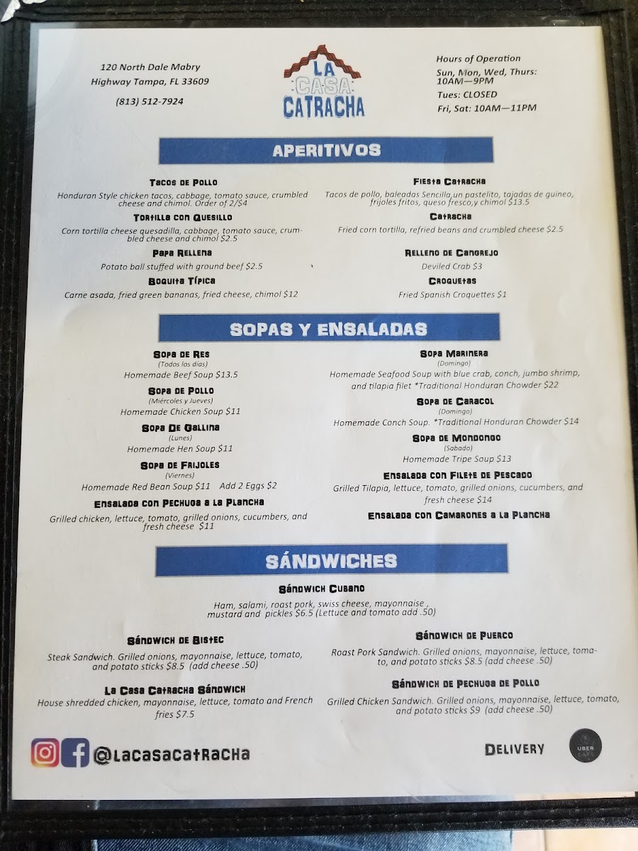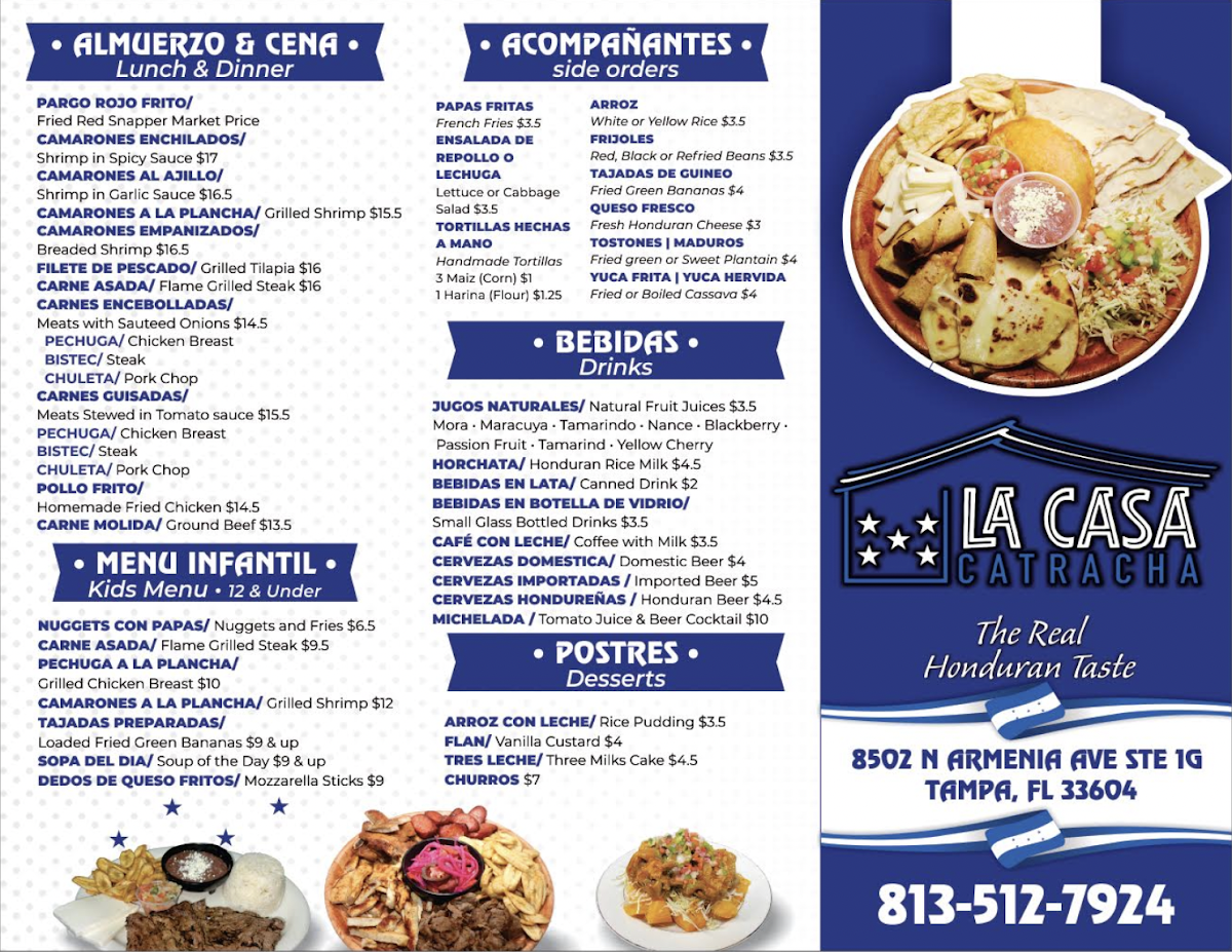 La Casa Catracha, where the heart of Honduras meets the vibrant culinary scene of Tampa! Nestled at 8502 N Armenia Ave #1-G, our menu showcases an array of mouthwatering specialties that will transport your taste buds straight to Central America. Indulge in our Pollo Con Tajadas, a local favorite, or savor the rich flavors of our Sandwich Cubano. For a true taste of home, don’t miss the Desayuno Típico, a traditional Honduran breakfast that will fuel your day. Adventurous eaters will love our Tajadas Preparadas—loaded fried green bananas that are simply irresistible! From fish soup to carne asada, every dish is crafted with passion and authenticity. Make sure to try our fiesta catracha sampler for a little bit of everything and pair it with a refreshing horchata or a cold cerveza Estrella. Come explore the delightful La Casa Catracha Menu, where every meal is an invitation to experience the warmth and richness of our culture.